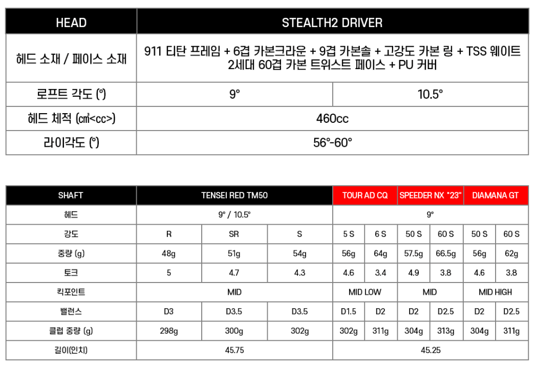 스텔스 2 드라이버의 기본 스펙입니다. 60겹 카본 트위스트 페이스가 가장 큰 특징입니다.