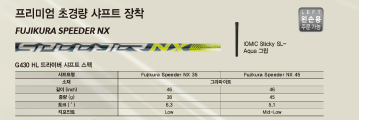 G430 HL MAX/SFT 드라이버는 프리미엄 초경량 샤프트 FUJIKURA SPEEDER NX 샤프트가 제공됩니다.