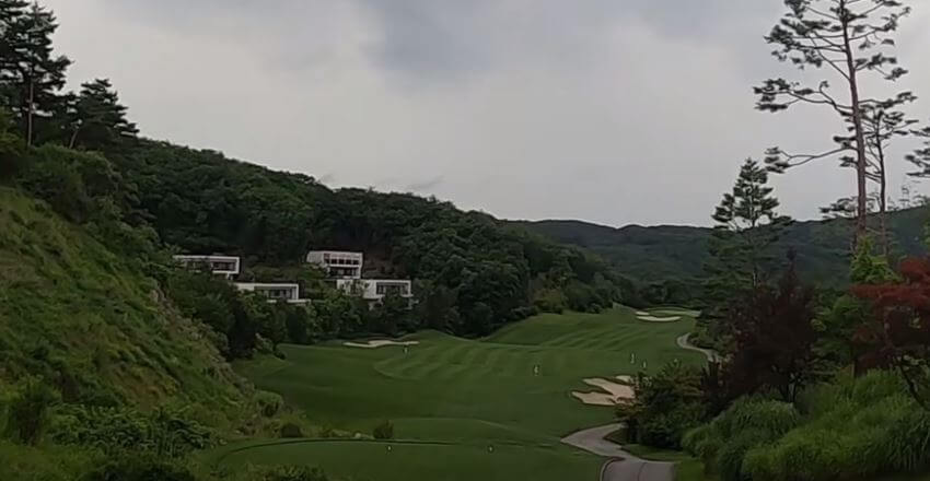 스타코스 마지막 9번홀은 파 5, 445미터로 좌측으로 휜 오르막 롱홀입니다. 좌측 해저드, 우측 OB이며 슬라이스 홀입니다. 중앙보다 좌측으로 공략하세요.