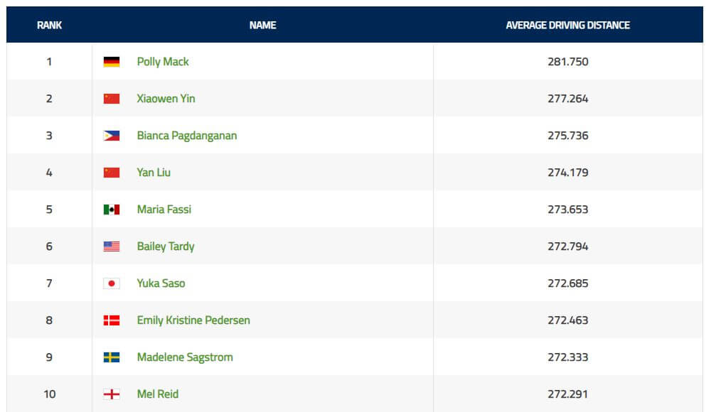 LPGA의 평균 드라이버 거리는 199미터이지만 2023년 드라이버 비거리 1위 폴리 맥 (Polly Mack) 선수의 비거리는 약 256미터 (281.7 야드)로 나타났습니다. 우리나라 방신실 프로는 이미 PGA 도 드라이버 비거리로는 접수를 했네요. ^^