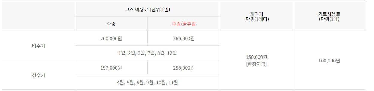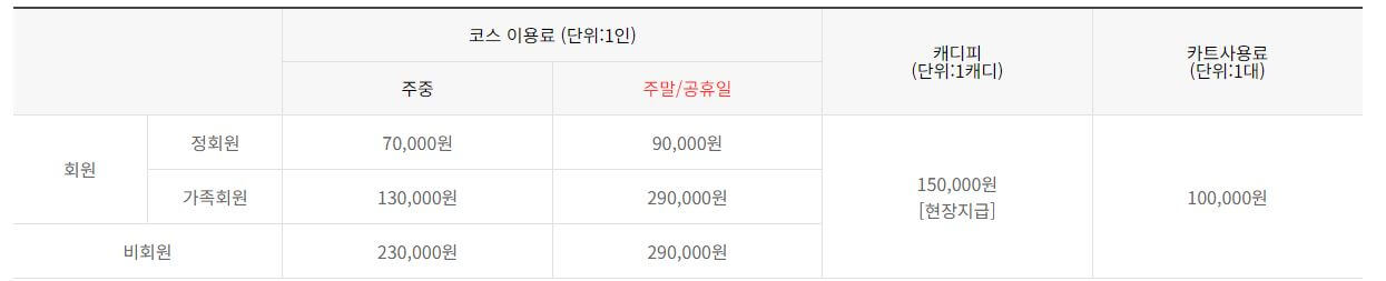 퍼블릭코스인 동, 남코스의 그린피는 주중 200,000원, 주말 260,000원, 캐디피와 카트비는 회원제 코스와 동일합니다. 자세한 그린피는 아래 요금표를 참고하세요.