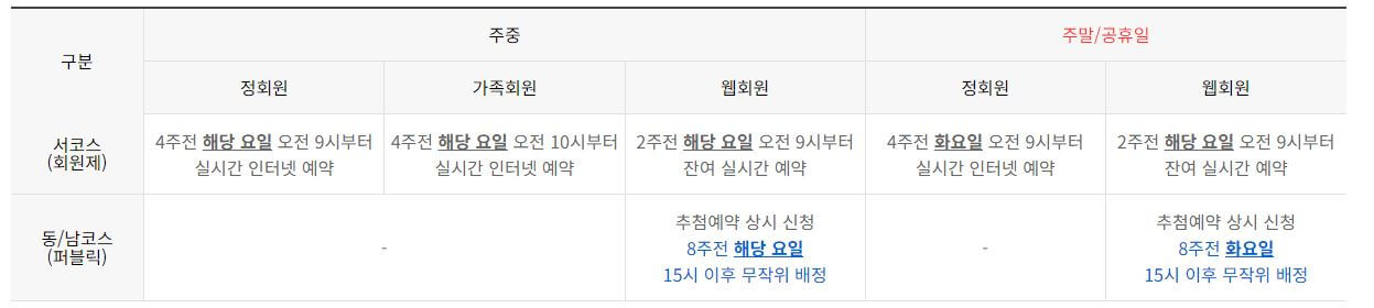 웹회원은 주중 예약의 경우 8주 전 해당 요일에 추첨예약을 신청하여 무작위 배정합니다. 자세한 예약방법은 아래 표를 참고하세요!