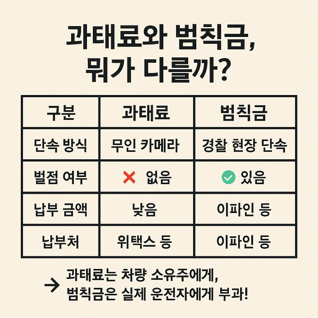 초과 속도 | 과태료 (카메라 단속) | 범칙금 + 벌점 (현장 단속) |