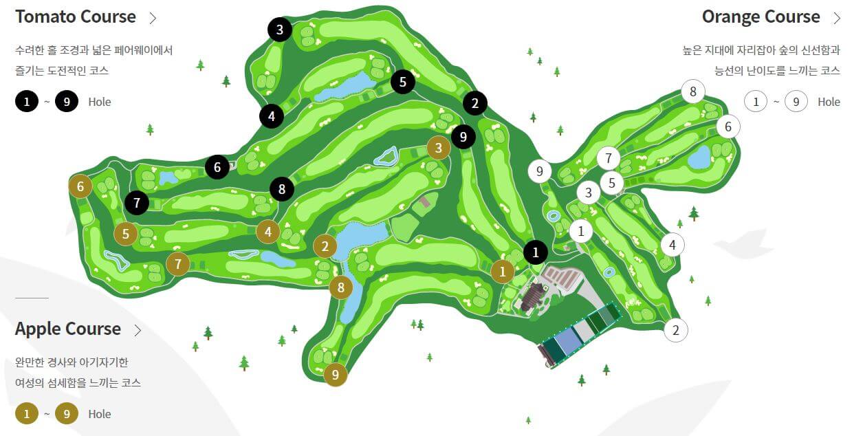 신안CC에는 정규 코스인 토마토, 애플 코스와 퍼블릭 코스인 오렌지 코스 총 36홀이 있습니다. 최근에는 회원제 정규코스를 예약해도 오렌지 코스를 포함하여 편성해 주기도 해서 오렌지 코스도 퍼블릭이 아닌 정규 코스 느낌입니다.