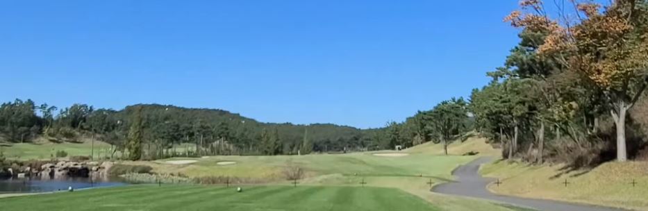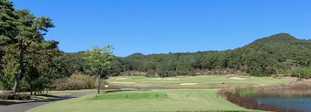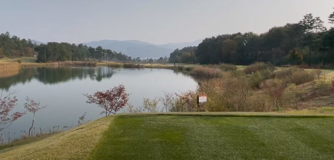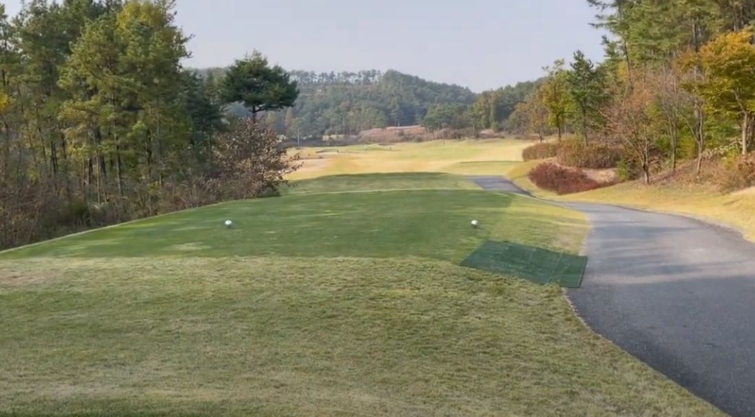 페럼클럽 CC 동코스 1번 홀은 파 4 340미터로 티박스 좌측의 연못을 넘기는 직선 형 홀이며 페어웨이 폭이 넓은 편입니다. 첫 번 홀은 힘 빼고 80프로 스윙으로 부드럽게  아이피 우측 방향을 공략하시면 세컨드샷 위치가 좋습니다.