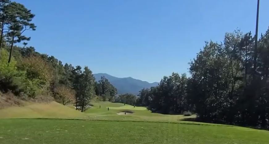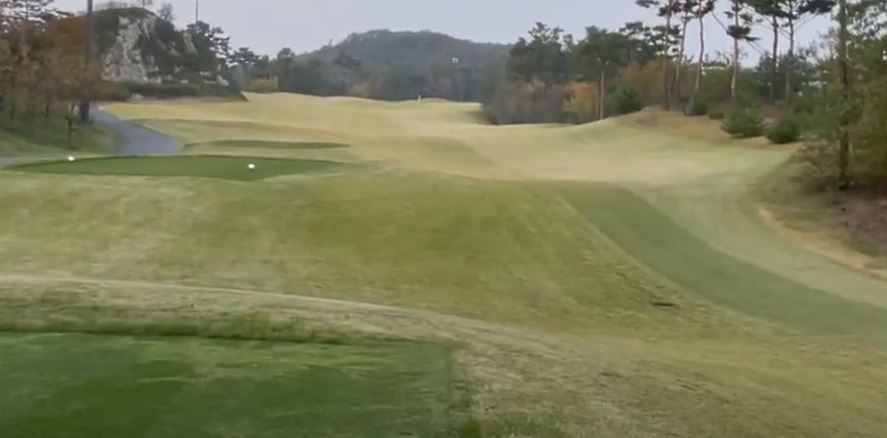 동코스 마지막 9번 홀은 파 5 440미터입니다. 짧은 내리막 롱홀이나 우 도그랙 형태라 우측으로 가면 세컨드샷이 어려워 끊어가야 하기 때문에 전방 벙커 방향으로 티샷해야 세컨드샷 시야를 확보할  수 있습니다.