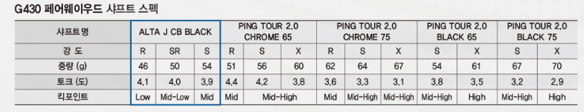 핑 G430 우드에는 공통적으로 ALTA J CB BLACK 샤프트와 PING TOUR 2.0 샤프트 두 가지 옵션이 제공됩니다.