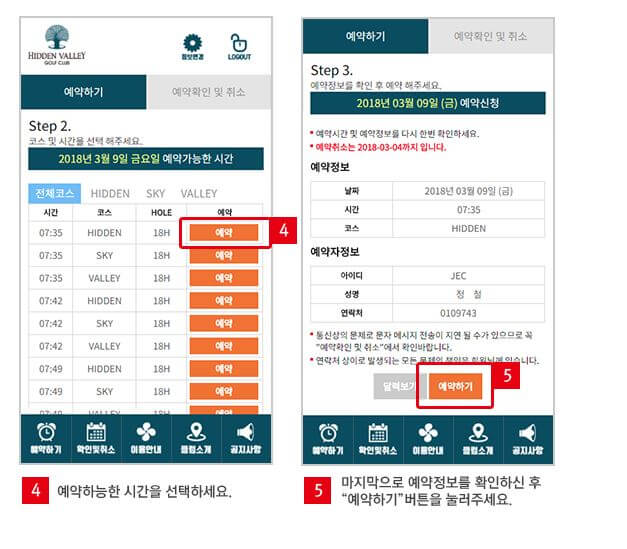 히든밸리cc 예약은 인터넷, 모바일, 또는 전화로 예약할 수 있습니다. 인터넷 예약은 아래 바로가기에서 원하는 날짜와 시간을 선택 후 예약하시면 됩니다.