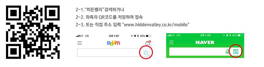 모바일 예약은 다음, 네이버, 구글 검색포털에서 "히든밸리"를 검색하시거나, 아래의 QR 코드를 통해 접속하시면 되고, 또한 직접 주소를 입력 "www.hinddenvalley.co.kr/mobile" 하여 예약하시면 됩니다.