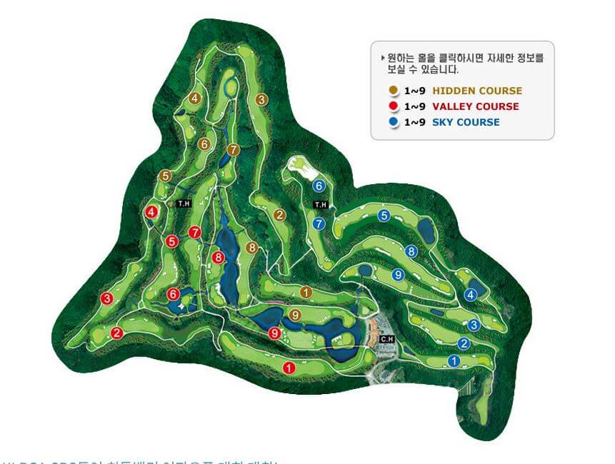 히든밸리CC 는 히든, 밸리, 스카이 코스 총 27홀로 구성되어 있습니다. 전체적으로 페어웨이 폭이 좁고 양쪽 오비구역이 많아서, 갈 때마다 긴장의 끈을 놓을 수 없는 골프장인데요, 특히 양잔디구장이라 다운블로우를 확실하게 해주지 않으면 헤드가 잡혀서 스코어가 잘 나오지 않는 골프장이라는 점 참고하세요.