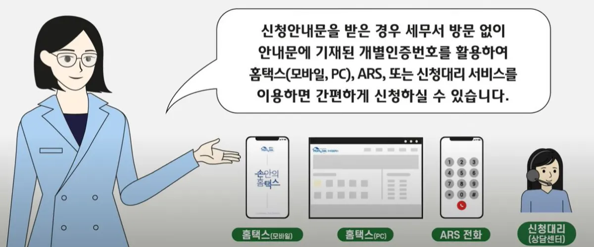 신청안내문을 받은 경우에는 세무서 방문 없이 안내문에 기재된 개별 인증 번호를 이용하여 홈택스, ARS 또는 신청대리 (상담센터)를 통해 간편하게 신청하시면 됩니다.