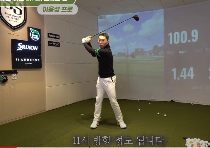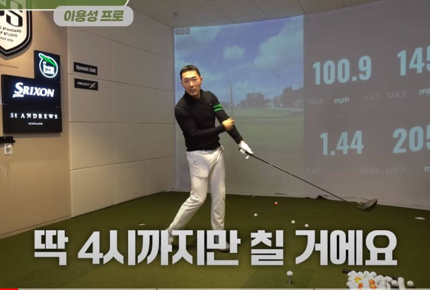 40대 50대 드라이버의 비거리 늘리는 특급 처방은 유튜브 이용성 프로의 레슨으로 설명드리겠습니다. 핵심은 백스윙탑에서 임팩트 구간에서 스윙 스피드를 최대화하는 타법입니다. 백스윙 탑에서 손의 위치가 11시라고 하면 다운스윙은 4시까지 스윙스피드를 최대화하고 팔로우 스루는 극단적으로 제한합니다.